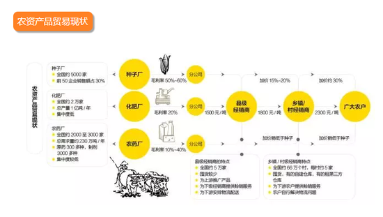 农用物资行业整体处于上升期,产品主要分为种子(市场空间约3500亿元)、化肥(7500亿元)、农药(3800亿元)、农机具(6000亿元)四大品类,这类农资电商平台试图为农户带来更低价的农资产品,去掉农资贸易过程中的县级、村级经销商。
