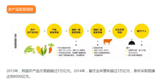 2013年,我国农产品交易市场规模超过5万亿元,整个交易过程中,仓储物流、金融服务仍然非常薄弱,而且存在着严重的价格不透明的问题。